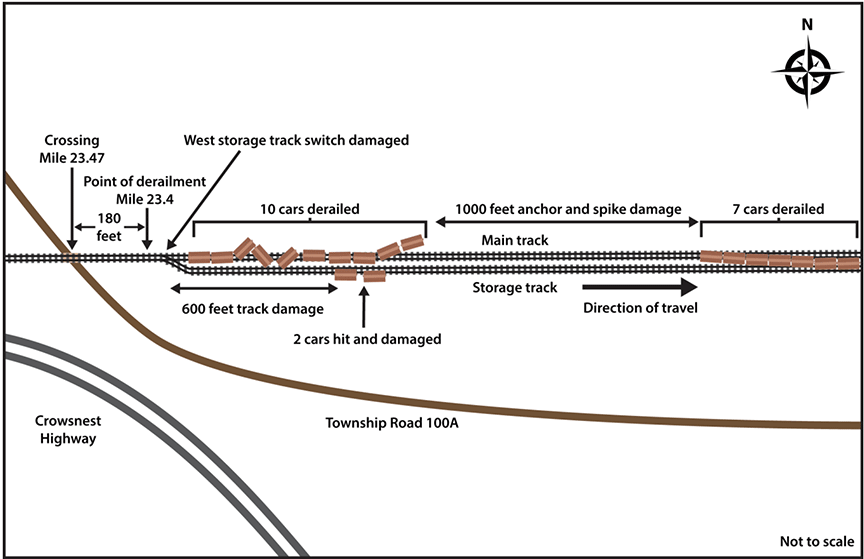 The point of derailment was determined to be a broken rail near a joint in the south rail located approximately 180 feet east of the crossing at Township Road 100A (Mile 23.47) (Figure 2).