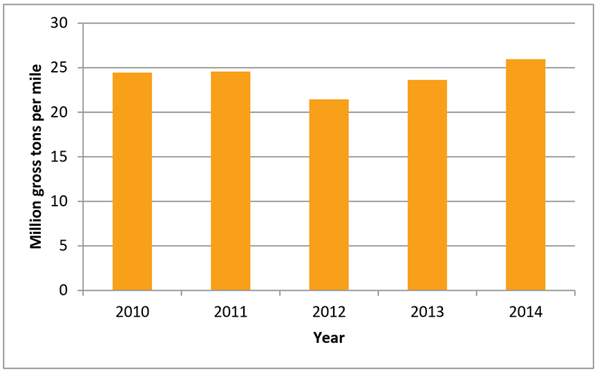 Traffic on the Crowsnest Subdivision was composed primarily of grain trains and coal trains, totalling about 26 million gross tons per mile (MGT per mile) in 2014 (Figure 3).