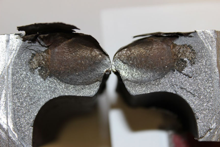 - The gauge and field sides of the head were deformed outwards, most likely due to compressive loading from passing rail cars.