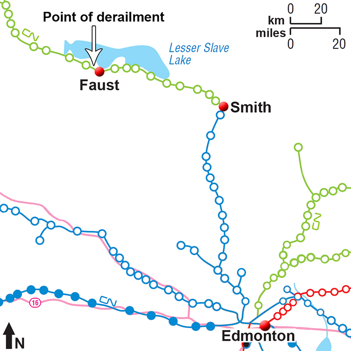 At approximately 1530Footnote 4 while the train was travelling at 17 mph, at maximum throttle and approaching the town of Faust, Alberta (Figure 1), a train-initiated emergency brake application occurred. Subsequent inspection of the train determined that the last 20 cars (107 to 126) had derailed.