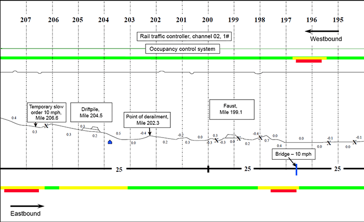 The track in the area of the derailment is tangent single main track, oriented east-west. In the direction of travel (west to east), between Mile 206.0 and 203.5, there is a descending grade varying between 0.2% and 0.5%. The track then levels off for about 1 mile (Mile 203.5 to Mile 202.5), and then transitions into a short ascending 0.4% grade (Figure 3).