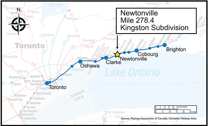 The Kingston Subdivision is patrolled every second day for potential track defects. On the day of the incident, a track supervisor, who was conducting the track patrol, obtained a track occupancy permit from the RTC for the north track between Newtonville (Mile 278.4) and Clarke (Mile 286.9).