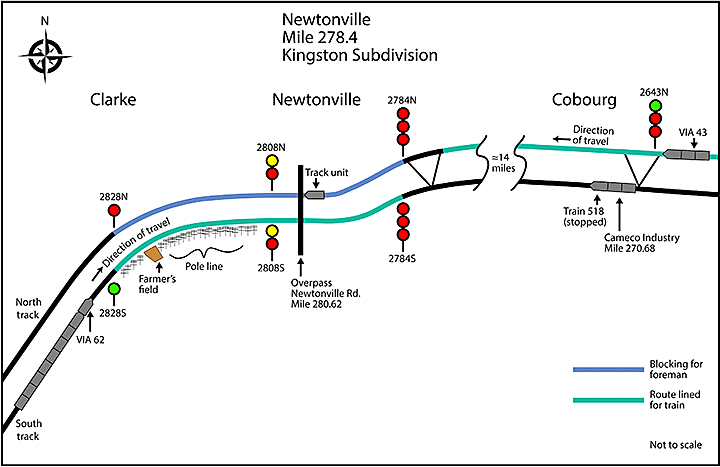 Canadian National (CN) train 518, a local switching assignment, was performing switching operations near Cobourg, two stations east of Newtonville (Figure 1). At about 0953, the rail traffic controller (RTC) called train 518 on the train standby channel, requesting that the crew contact the RTC before leaving, to cancel an authority. Train 518 was switching in the north yard at Cobourg as was common practice for this assignment. VIA 62's crew overheard this exchange. At about 1004, after cancelling the authority on the RTC's channel, train 518 departed Cobourg from the north track and crossed over onto the south track, westbound, destined for Cameco Industry (Mile 270.68), near Port Hope, Ontario. VIA 62's crew was unaware that train 518 was approaching on the south track from Cobourg (Figure 1). At about 1011, VIA 62's crew identified and called the intermediate signal (Signal 2828S at Mile 282.8) as a Clear signal (single green light).
