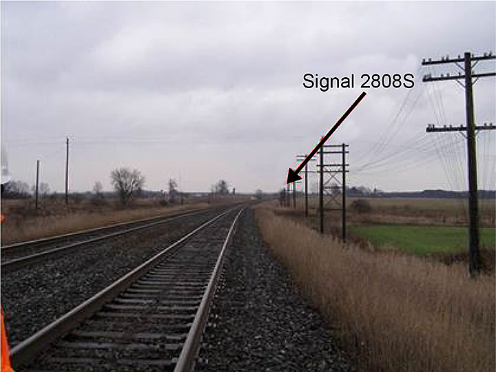 In addition, Signal 2808S was checked for alignment. At 12 feet above the top of the rail, the maximum unobstructed line of sight for this location was determined to be 1,805 feet.Footnote 11
