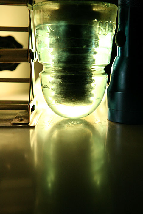 The TSB Engineering Laboratory conducted testsFootnote 8 on the glass insulators from the pole line recovered from the occurrence site (Photo 1). When a white light was placed behind a green insulator (Photo 2), the light appeared to be a green colour. Similarly, when a white light was placed behind an amber insulator, the light appeared to be an amber colour.