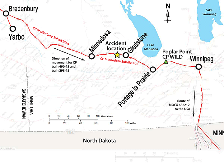The Minnedosa Subdivision consists of single main track that extends west from Portage la Prairie, Manitoba (Mile 0.0) to Minnedosa (Mile 77.9). Train movements in the vicinity of the derailment are governed by the occupancy control system (OCS) as authorized by the Canadian Rail Operating Rules (CROR) and supervised by a rail traffic controller (RTC) located in Calgary, Alberta. OCS rules apply in non-signalled territory where an RTC supervises train movements on the territory through the use of clearances, track occupancy permits, general bulletin orders, and other instructions as may be required.