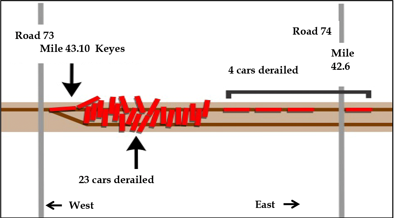 Site examination determined that 27 cars—the 16th to the 42nd cars inclusive from the head end of the train—had derailed. The derailed cars came to rest in various positions, blocking the main track and siding between Miles 42.6 and 43.10 (Figure 2).