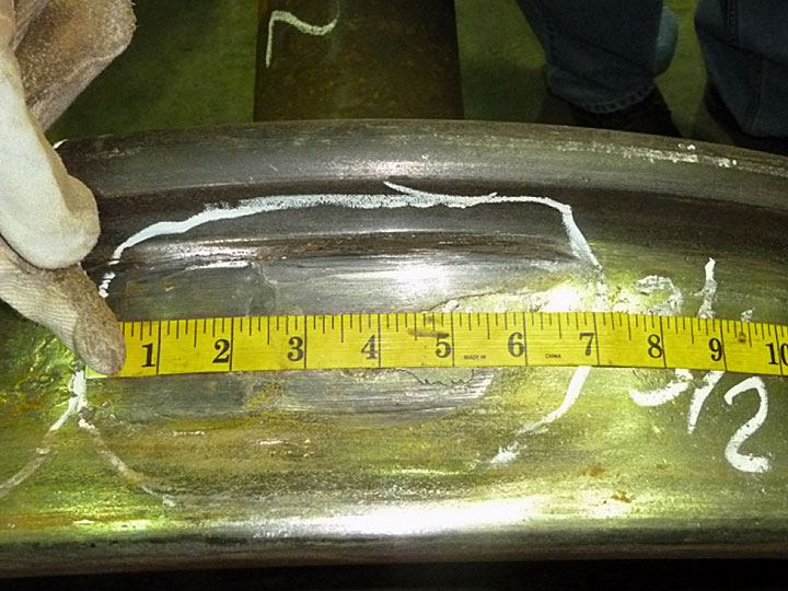 • The L2 wheel tread had 2 adjoining condemnable slid flats (2.5 and 3.5 inches long) that combined to form a 6-inch-long flat spot on the tread surface (Photo 5). The mate R2 wheel tread had one 2-inch-long and one 3.5-inch-long condemnable slid flats;