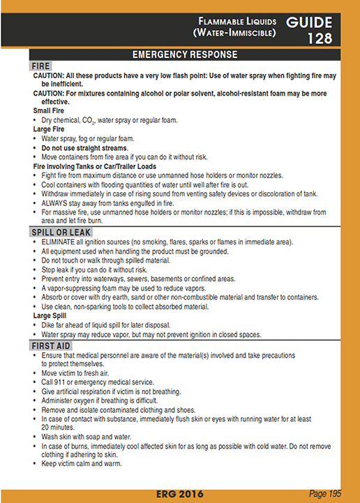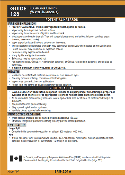 Styrene monomer, stabilized (UN2055) is classified as a Class 3 flammable liquid in Packing Group (PG) III under the Transportation of Dangerous Goods. Regulations.Footnote 7 This product is water-immiscible (i.e., it does not mix with water). Transport Canada's (TC) Emergency Response Guidebook.(ERG) directs first responders to Response Guide 128 (Appendix A),Footnote 8 a reference to assist first responders in making initial decisions upon arrival at an accident site involving dangerous goods.