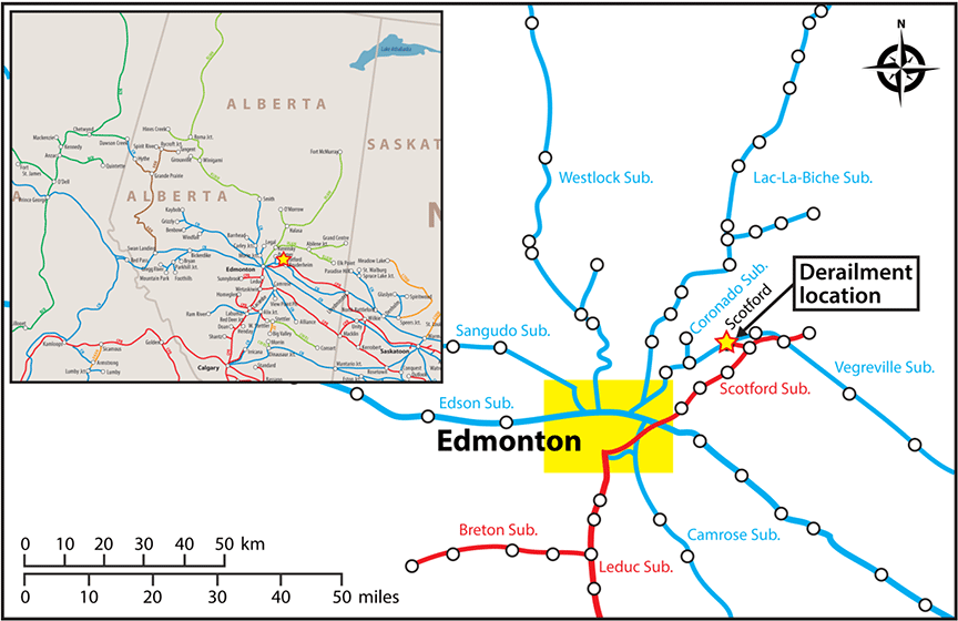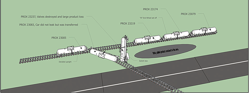 Unaware that the west wye switch had been damaged, the crew started to shove the movement eastward, resulting in the derailment of 4 tank cars at approximately 1525. During the derailment, the brake pipe disconnected and the air brakes applied in emergency,Footnote 5 bringing the movement to a stop. The crew immediately provided site protection and made an emergency call to the CP supervisor at Lambton Park in Edmonton, Alberta. Noting that product had been released, the crew also contacted Shell Canada, which deployed its emergency response team to the site.