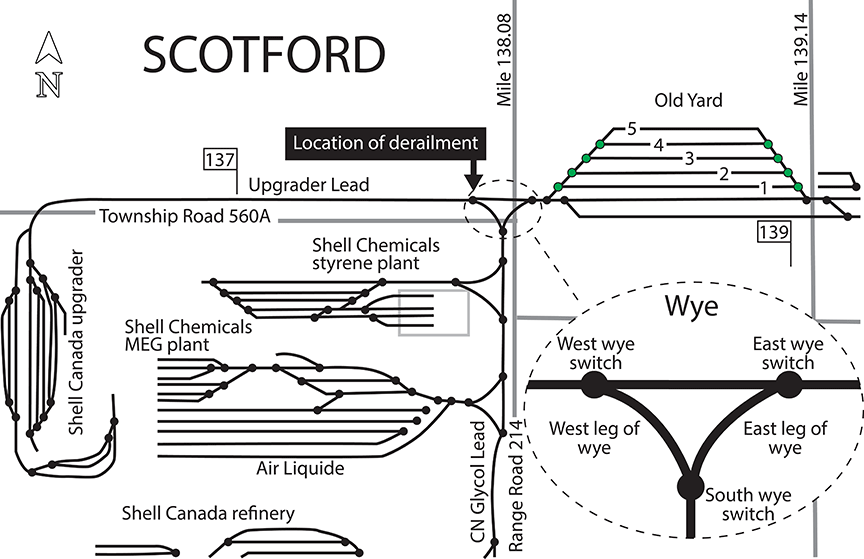 At the beginning of the shift, the crew, consisting of a yard foreman and a yardman, had operated the assignment westward with 22 cars from the Old Yard to service Shell Canada's Scotford Upgrader (Figure 2). After servicing the upgrader, the assignment departed with 28 cars. On the return move, the crew decided to wyeFootnote 1 the movement, which would reorient the locomotive consist so that the controlling locomotive faced westward, which was the orientation the crew was most familiar with.Footnote 2