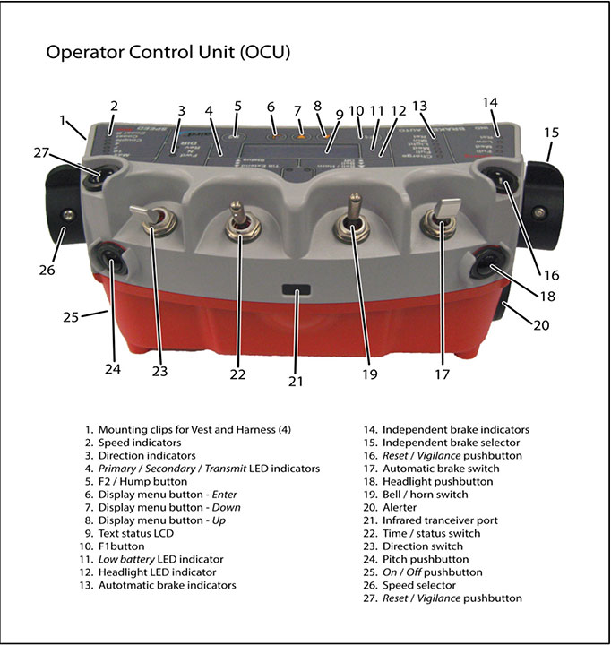 The Beltpack allows yard crews to control equipped locomotives without an LE. Crew members can pass control of the locomotives back and forth between them as required, but only 1 crew member can have control at any given time. Radio commands transmitted from the Beltpack are received and processed by the OCC in the RCL.