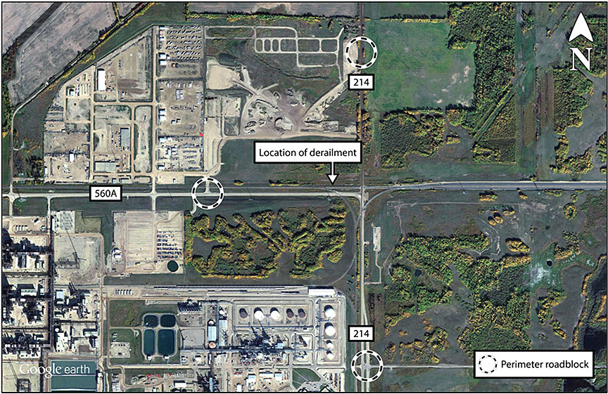 Royal Canadian Mounted Police and Shell Canada security teams set up roadblocks at both ends of Range Road 214 and Township Road 560A to control access to the site (Figure 8). However, in the early hours of 09 December 2015, a television news team illegally gained access to the derailment site via Township Road 560A. The news team took some photographs and were removed from the site shortly after. Although they had entered the hot zone, the emergency phase of the response was over. The members of the news team did not report any ill effects from exposure to styrene monomer. There were no other unauthorized entries into the hot zone.