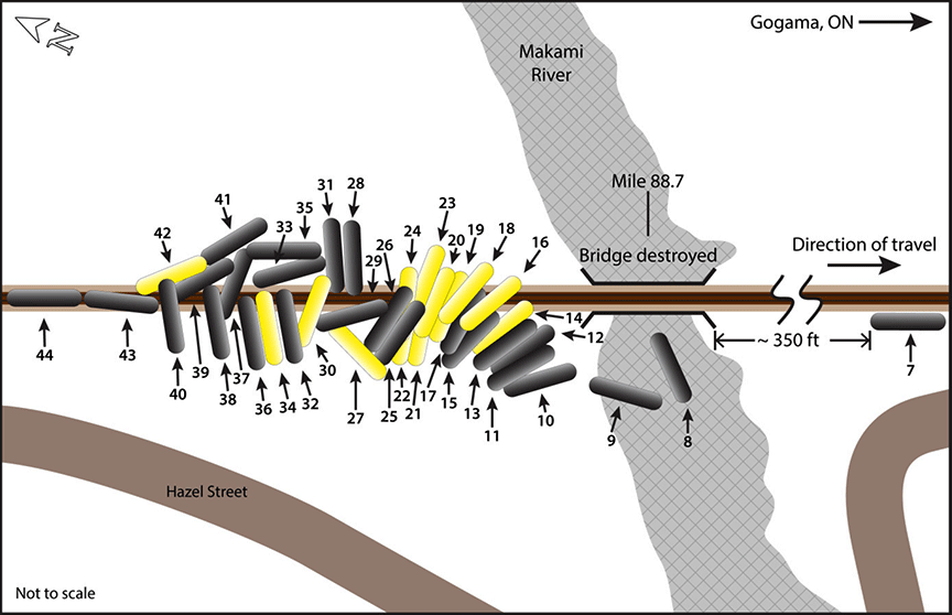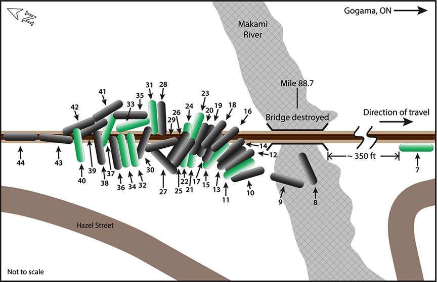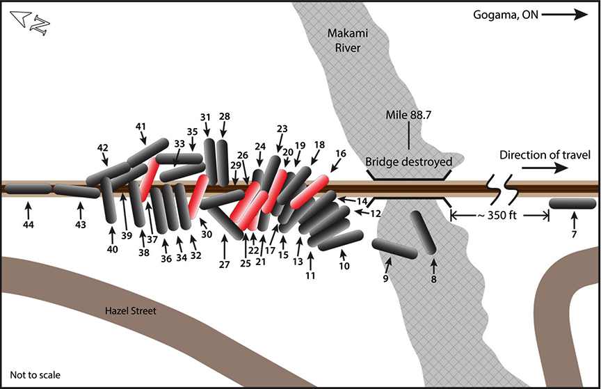 The majority of the tank cars derailed along the north shore of the river just east and west of the north abutment of the rail bridge. Two tank cars came to rest in the river. Initially, there was visual evidence of released product in the river and along the north shore, east and west of the mainline.