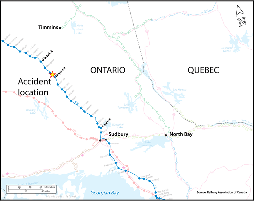 The accident occurred about 2 miles west of the town of Gogama and 0.25 miles east of Highway 144. There was good access to the site, which facilitated mitigation activities.