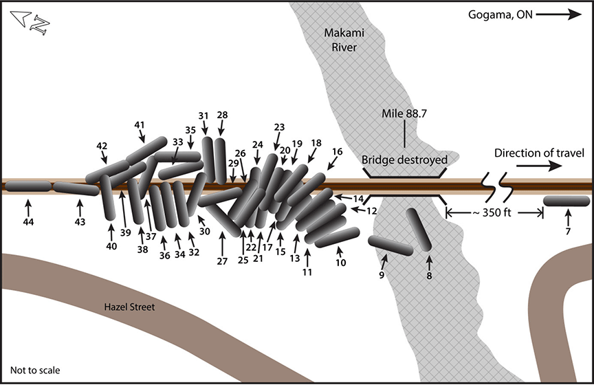 The 6th to the 44th cars from the head end (39 tank cars) had derailed (Figure 2). The 6th car (VMSX 310431) had travelled across the rail bridge over the river and derailed upright to the south of the track. The 6th car was subsequently re-railed and removed from the site. The trailing end of the 7th car (VMSX 310442) had struck the south side of the bridge structure and rolled down the south side embankment about 350 feet east of the bridge. Its bottom outlet valve was damaged and product was released. The 8th car (VMSX 311916) struck the bridge heavily and came to rest in the river south of the bridge, along with parts from 5 other cars. Most of the remaining derailed cars had jackknifed on the west approach to the bridge and travelled down the south embankment. The last two derailed cars, the 43rd and 44th cars (VMSX 310060 and VMSX 311681), derailed upright and came to rest near Mile 88.75.