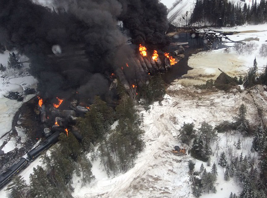 On 14 February 2015, at about 2335 Eastern Standard Time, Canadian National Railway (CN) crude oil unit train U70451-10 was proceeding eastward at about 38 mph on CN's Ruel Subdivision when it experienced a train-initiated emergency brake application at Mile 111.7, at Gladwick, near Gogama, Ontario. A subsequent inspection determined that the 7th through 35th cars (29 cars in total) had derailed. Nineteen of the tank cars were breached, and about 1.7 million litres of petroleum crude oil were released to either atmosphere or surface. The released product ignited, and the fires burned for 5 days. About 900 feet of mainline track was destroyed. There was no evacuation, and there were no injuries.Footnote 89