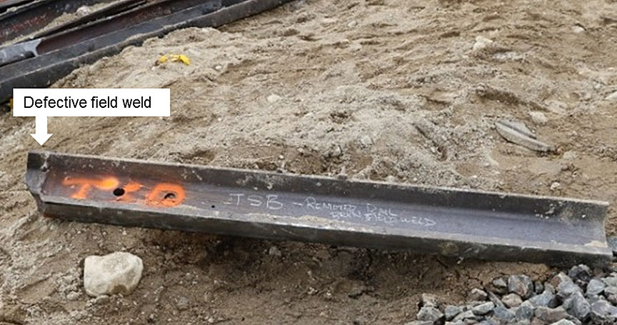 - Sitting beside the track were 2 sections of rail, one measuring 68 inches long and one measuring 78 inches long, which contained a defective field weld (DWF) that had been removed from the south rail 3 days before the accident, during the repair of a broken rail (Figure 5).