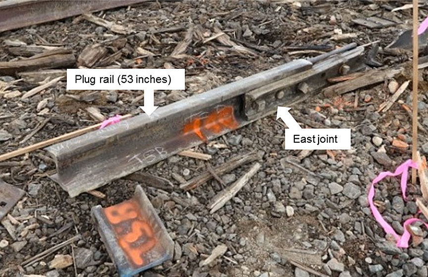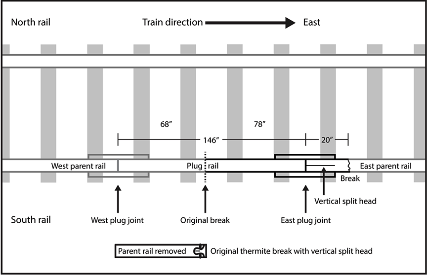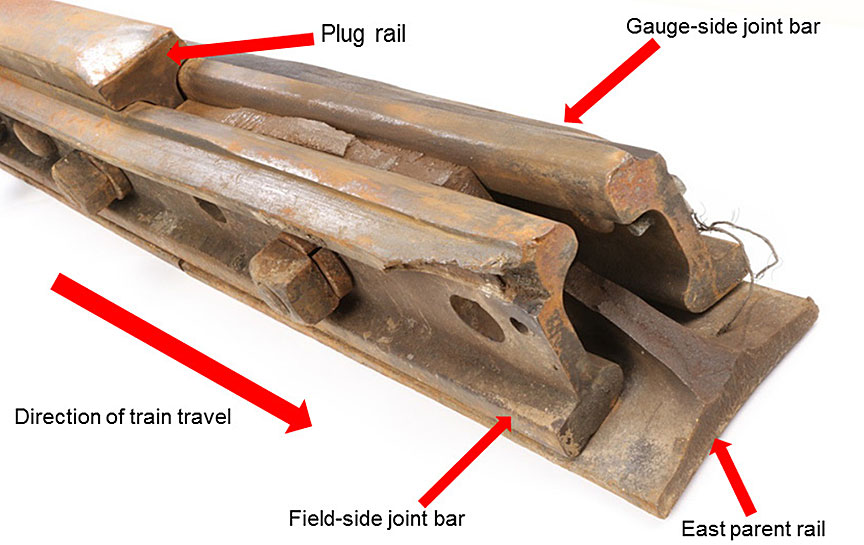 - The east joint of the plug rail, with joint bars still holding together an intact 53-inch-long section of plug rail and a fractured 20-inch-long section of parent south rail, was recovered about 265 feet west of the west bridge abutment (Figure 6).