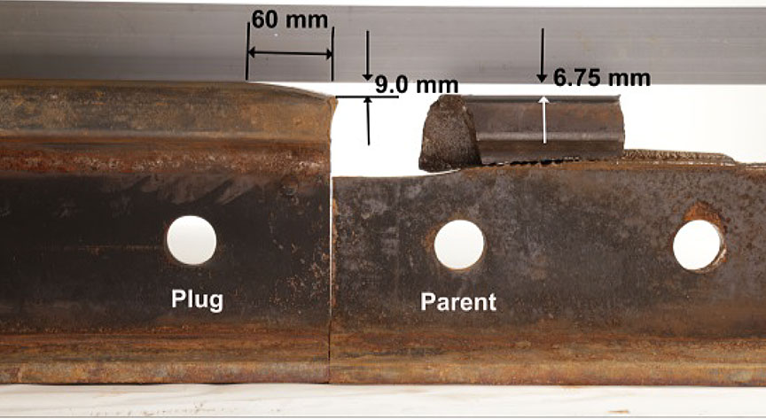 - The north rail failed in the vicinity of an identified localized surface collapse due to the development and propagation of a VSH defect from a pre-existing weakness in the rail due to web streaking (i.e., centreline segregation) (Figure A1).