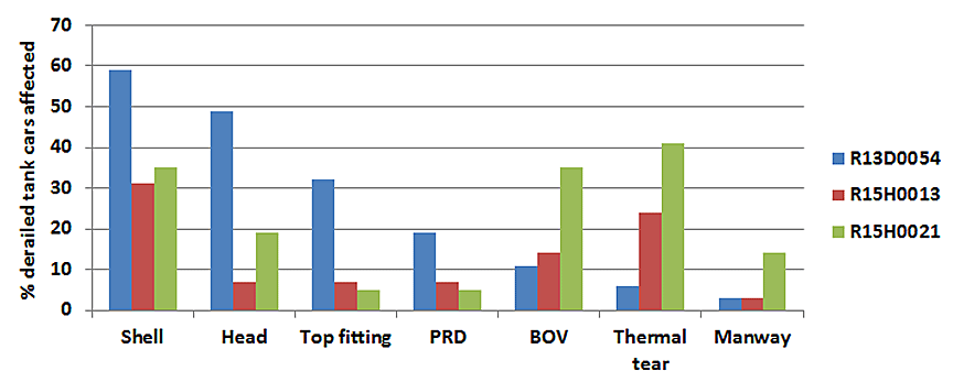 None of the tank cars had thermal protection. During the derailment sequence, 2 tank cars were punctured, and released more than 50 000 gallons of crude oil. Of the 27 tank cars that derailed, 19 cars were involved in a pileup and the post-derailment pool fire. The pool fire caused thermal tank shell failures on 13 tank cars that had initially survived the accident. Only 1 tank car at the edge of the pool fire survived without release. The other 8 derailed tank cars, which were positioned on either side of the pool fire, were not significantly damaged and did not release product.