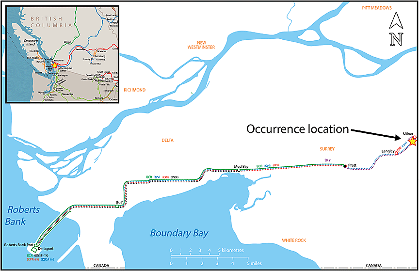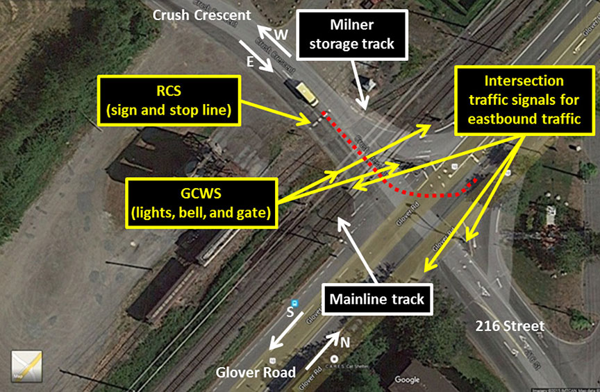 The occurrence crossing (the crossing) is located in Langley at Mile 18.81 of the Page Subdivision. The crossing, which intersects Crush Crescent and runs parallel to Glover Road, is equipped with a GCWS consisting of flashing lights, bell, and gates. The GCWS was working as intended at the time of the occurrence.