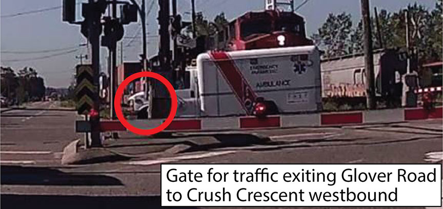 • As the ambulance approached the main track, the crossing gate for the westbound traffic from 216th Street traversing Glover Road for Crush Crescent had already begun to descend.