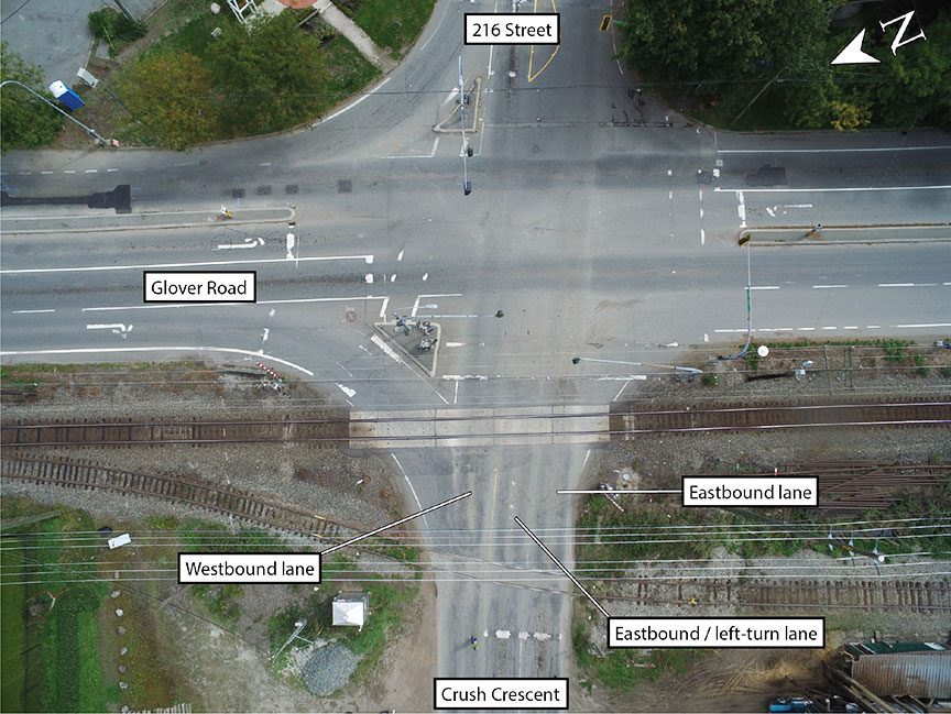 The crossing and the connected roadways are under a number of jurisdictions. Crush Crescent and 216th Street are under the jurisdiction of the Township of Langley. The British Columbia (BC) Ministry of Transportation and Infrastructure (MOTI) has responsibility for Glover Road (Highway 10) and the traffic signals on Glover Road, which also control movements to and from these adjoining roads. MOTI shares responsibility with CP for the interconnection of the traffic signals with the GCWS at the railway crossing that intersects Crush Crescent. The operation and maintenance of the GCWS at the grade crossing is the responsibility of CP. Responsibility for the application and the maintenance of the roadway markings at this crossing is unclear.Footnote 7
