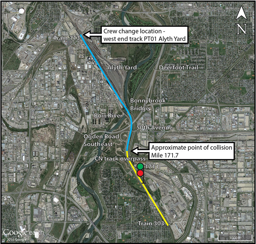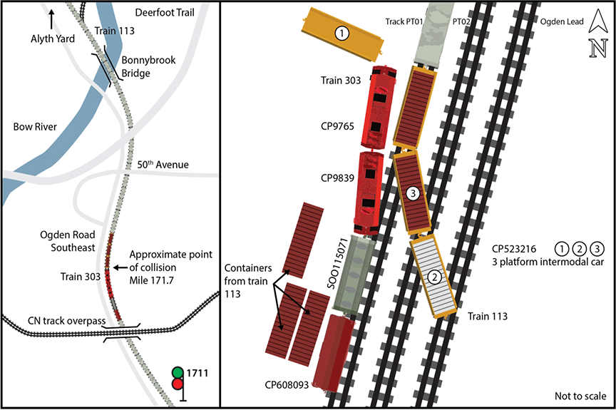 At 0917, train 303 received a Clear signal indication on signal 1711Footnote 3 at Ogden, authorizing the train to depart the main track and to continue into the non-main track at Ogden. While proceeding past the signal, the locomotive engineer overheard parts of a radio conversation concerning train 113 and a depot track. Based on this radio communication, the locomotive engineer believed that train 113 was undergoing a passing inspection at the depot track, about 3 miles further west. The crew of train 303 then radioed train 113 for a location report. However, the Calgary TTM responded, indicating that train 113 had not yet departed Alyth Yard. The crew of train 303 then contacted the Calgary TTM to ask about the length of train 113.