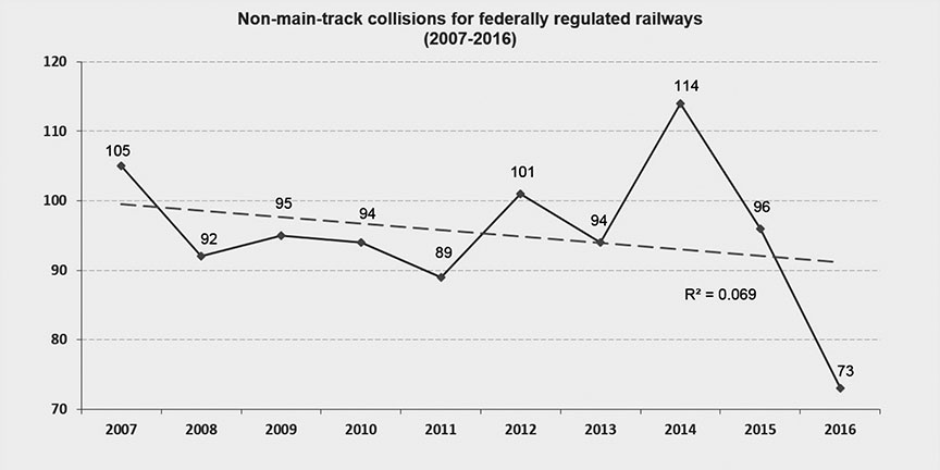 The regulatory requirement for non-main-track train movements to be able to stop within half the range of vision of equipment is an effective strategy in most circumstances. However, operating crews do not always comply with this requirement. There has been an average of about 95 non-main-track collisions on federally regulated railways each year. For the majority of these occurrences, the maximum speed was 15 mph. As a result, the consequences of most non-main-track collisions were minor.