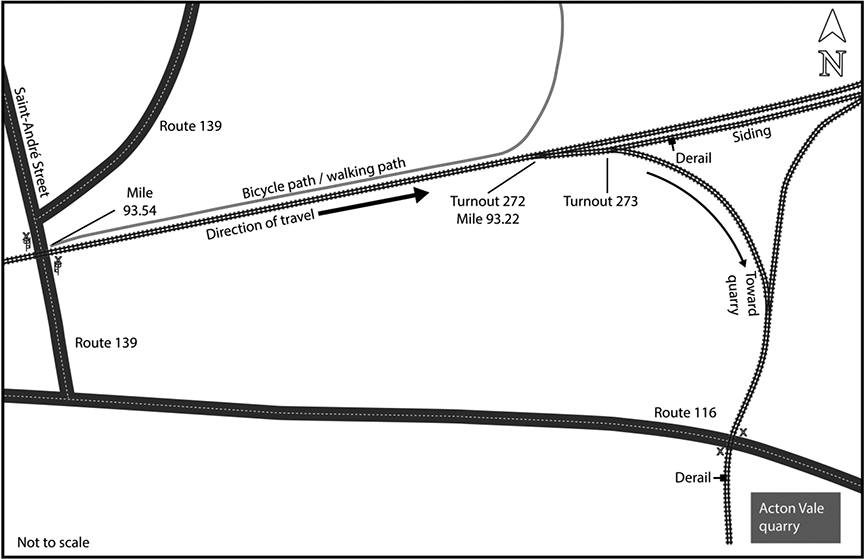 Work began to the west of turnout 272. The warning devices of the 3 level crossings located in central Acton Vale (Saint-André, du Marché, and Dalpé streets) had been disabled during the work to prevent unnecessary disruptions to road traffic. At approximately 1200, one of the machines broke. Because the machines work in tandem, both machines were moved to the Acton Vale quarry so that the broken machine could be repaired. The route leading to the quarry required the switches at turnouts 272 and 273 to be handled and the derail located at the entrance to the quarry to be placed in the non-derailing position.