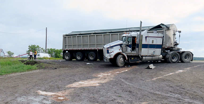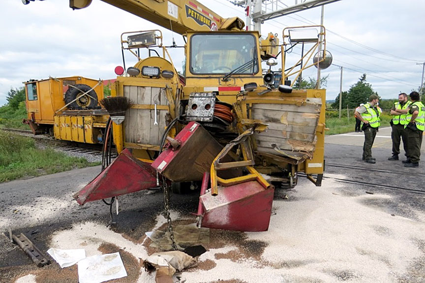 On 18 August 2016, at approximately 0330 Eastern Daylight Time, Canadian National Railway Company (CN) track unit CN461-18 was travelling northward at approximately 16 mph (26 km/h) on the CN Joliette Subdivision. At the Highway 347 public grade crossing, at Mile 90.61, near the municipality of Saint Norbert, Quebec, the track unit collided with an eastbound tractor-trailer. Two employees on board the track unit and both occupants of the tractor-trailer sustained minor injuries. Approximately 600 L of diesel fuel and hydraulic fluid were released from the track unit and the tractor trailer.