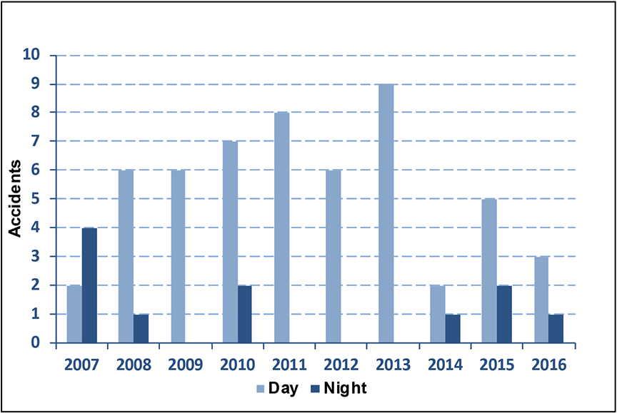 According to the TSB's railway occurrence database, from 2007 to 2016, there were 65 occurrences involving a TU at a grade crossing. Of those, 39 happened at grade crossings with warning devices and 28 involved insulated TUs that could not activate grade crossing warning devices. During that same period, 11 accidents occurred at night (Figure 7). As well, 2 accidents occurred while a flag‑person was protecting the crossing and the warning device was not activated.