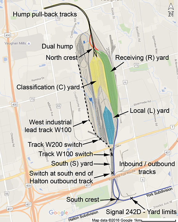 MacMillan Yard (Figure 2) is CN's main classification yard in Eastern Canada, where rail traffic is distributed by flat switching or "humping"Footnote 2 rail cars into various tracks for placement on different trains. MacMillan Yard operations are conducted under Canadian Rail Operating Rules (CROR) Rule 105. Train movements are restricted to speeds of up to 15 mph and must be able to stop within half the range of vision of equipment. The yard processes up to 1 million cars annually.Footnote 3 On any given day, there are 15 to 20 assignments working in the yard. There are up to 150 operating employees working at various jobs (local, yard, humping operations) at MacMillan Yard. Most MacMillan Yard assignments and some work assignments are operated by 2 qualified conductors, each equipped with an RCLS Beltpack,Footnote 4 enabling either crew member to control the locomotive.