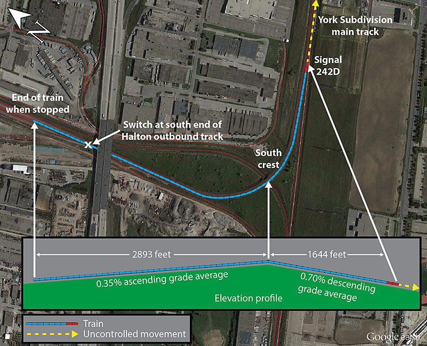 Yards are generally designed with a bowl-shaped profile to protect against freight cars rolling uncontrolled onto the main track during switching and/or humping operations. MacMillan Yard has a descending grade from both the north and south end of the tracks toward the centre of the yard, giving it such a bowl-shaped profile. At the south end of the yard, the south crest of the bowl is located 1644 feet west of Signal 242D (Figure 3), on top of the Halton Subdivision railway overpass. There is a 0.35% ascending grade for trains approaching the south crest from the north. There are no signs identifying the location of the south crest to train or assignment crews. Over the crest, there is an eastward 0.70% descending grade approaching Signal 242D and extending onto the York Subdivision.