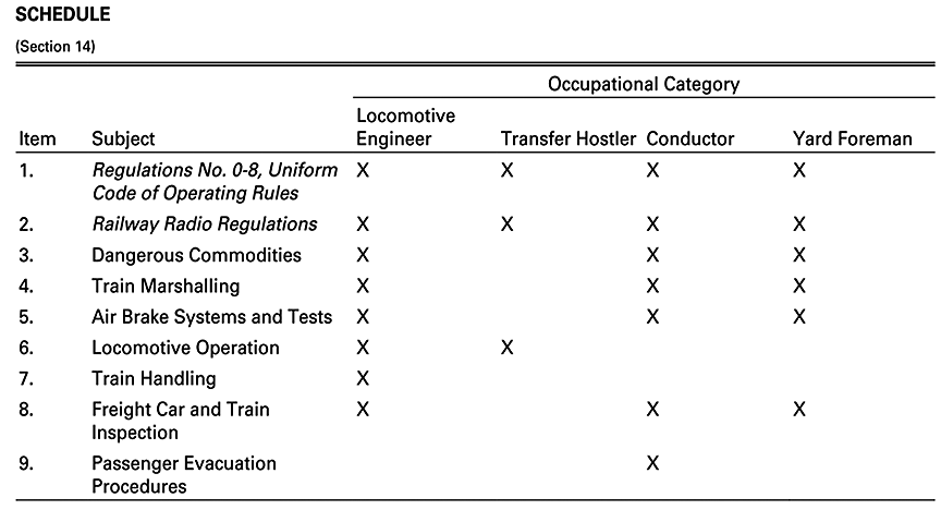 1. The subjects required for a person to qualify for an occupational category are the subjects listed in those items of the schedule marked with an "X" under the heading that corresponds to the occupational category, excluding those subjects or portions of subjects dealing with equipment that is not used by the railway company that employs the person.