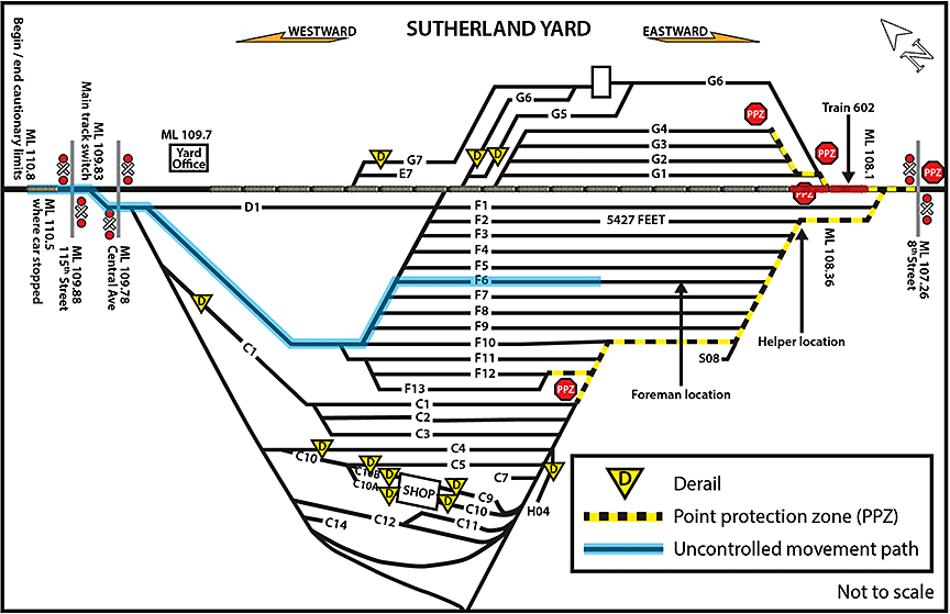 With no derail in place to protect the main track, the car rolled uncontrolled for about 1 mile and traversed 2 public crossings, located at Central Avenue (Mile 109.78) and 115th Street (Mile 109.88), which were both equipped with grade crossing warning systems (GCWS). The car came to a stop at Mile 110.5 on the main track, within cautionary limits.Footnote 4 There were no injuries and no derailment. No dangerous goods were involved.