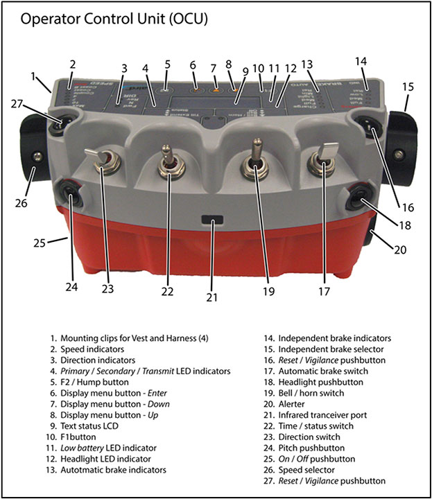 Crew members can pass control of the locomotives back and forth between them as required (pitch and catch), but only 1 crew member can have control at a time. The OCU is equipped with (but not limited to) a speed selector, a forward and reverse selector, and a brake selector that includes an emergency brake feature (Figure 6).