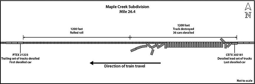 Leading up to the occurrence site, there were no wheel marks on the track infrastructure. The first derailed car (with the trailing set of trucks derailed) was PTEX 21223, the 107th car from the head end. The following 36 derailed cars came to rest in various positions on the right-of-way. The last of the derailed cars (with the lead set of trucks derailed) was CEFX 302181, the 142nd car from the head end (Figure 2).