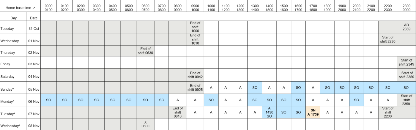 Legend: AD = awake and on duty, A = awake and off duty, SN = nap, SO = sleep opportunity