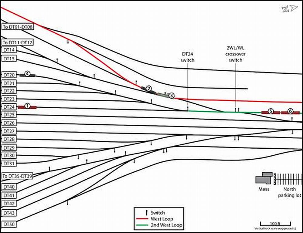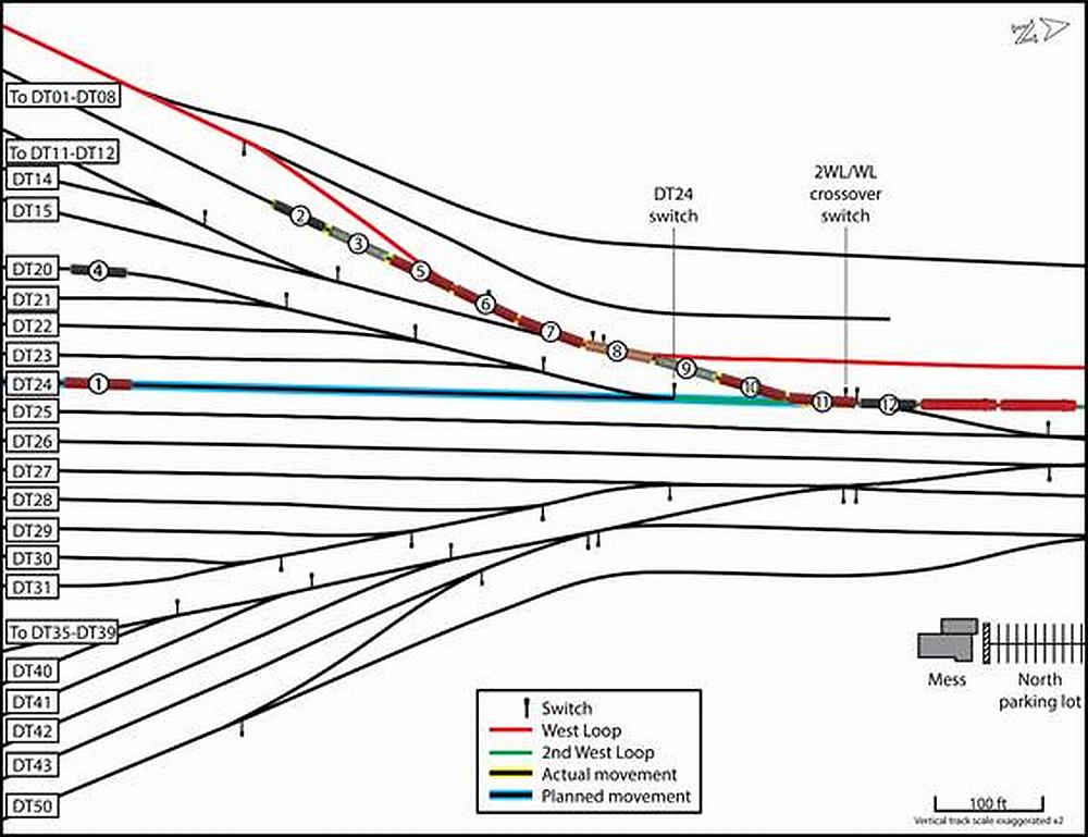 3. The yard helper instructed the locomotive engineer to stop the assignment past the 2nd West Loop / West Loop (2WL/WL) crossover switch, which is located north of the DT24 switch on the 2nd West Loop, further than was necessary to complete the next move. This was where the yard helper had been positioned before entering the mess building.
