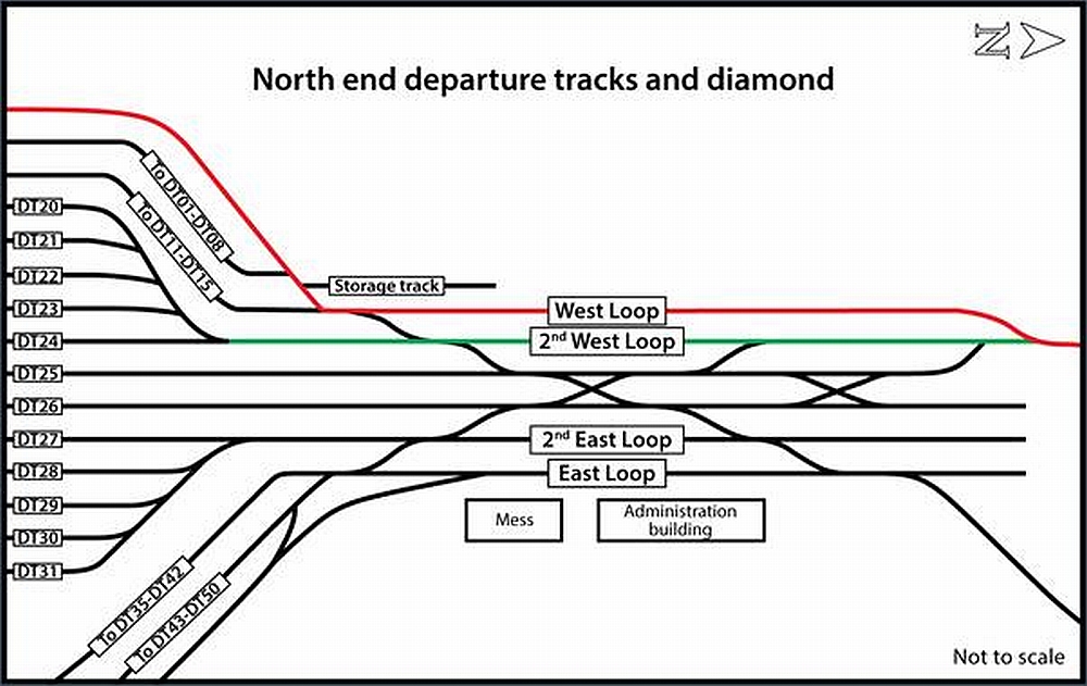 Tracks DT01 to DT24 are located on the west side of the yard and are accessible from the 2nd West Loop, while tracks DT27 to DT50 are on the east side of the yard and are accessible from the 2nd East Loop. Tracks DT25 and DT26 divide the yard into its east and west sides and are accessible from the intersecting crossovers. The switches at the north end of the departure tracks and the switches on the diamond are hand-operated.