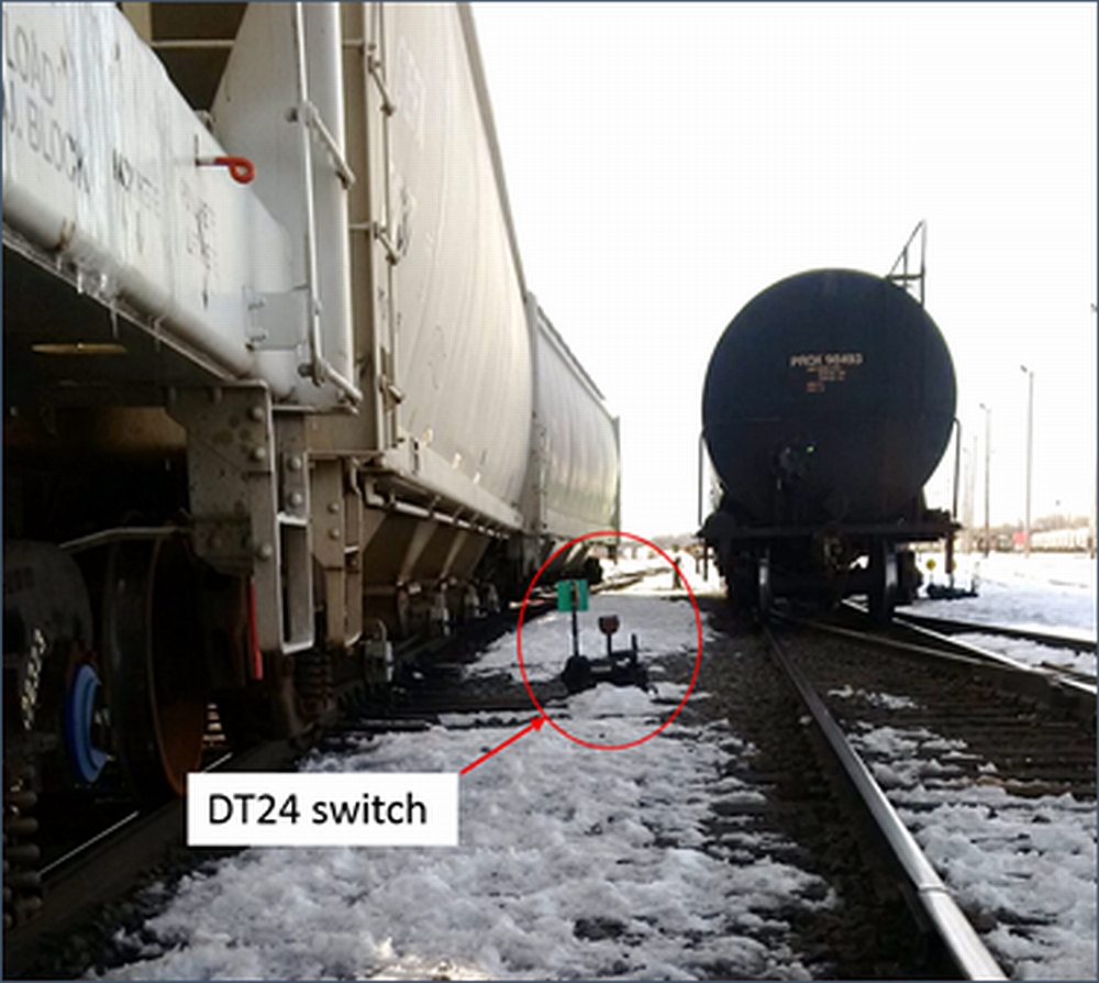 5. R09Q0030 – On 17 July 2009, at approximately 1900 Eastern Daylight Time, CN remotely controlled yard assignment YLUS-30 derailed 5 tank cars at Limoilou Yard in Québec, Quebec. A turnout and about 180 feet of track were damaged. No one was injured, but there was a minor fuel leak. As turnout EL18 had a hand-operated switch stand, it was not designed to allow rolling stock to trail through it and was required to be set for the route being used. During the point movement, the assignment trailed through the switch. As the switch was not equipped with a semi-automatic switch stand, it was damaged and therefore no longer permitted reverse movement. Furthermore, as the helper usually saw the switch in its normal and locked position and his attention was likely focused on the activity at the crossings, he did not observe the switch target and did not realize that the assignment had trailed through and damaged the switch.