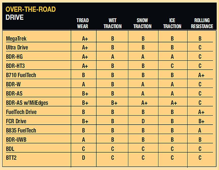 To help school bus companies select tires for particular driving conditions, Bridgestone provided a general guideline that rates tread performance for retread applications based on its internal testing of 5 different criteria (tread wear, wet traction, snow traction, ice traction, and rolling resistance). Engineering judgment and field performance feedback are also considered. Bridgestone uses the data to validate design expectations and for comparative purposes. However, there are no regulatory or industry standards to evaluate traction test results in order to determine which tires were most suitable for winter driving.