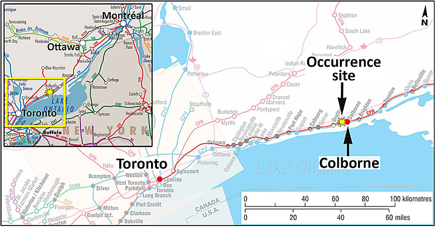 On 13 February 2017 at about 0555,Footnote 1 Canadian Pacific Railway (CP) freight train No. 142-12 departed Toronto, Ontario, on the Belleville Subdivision and was destined for Montréal, Quebec (Figure 1). The train consisted of 2 head-end locomotives and 73 cars. It weighed 8520 tons and was 8486 feet in length. The train crew consisted of a locomotive engineer and a conductor.
