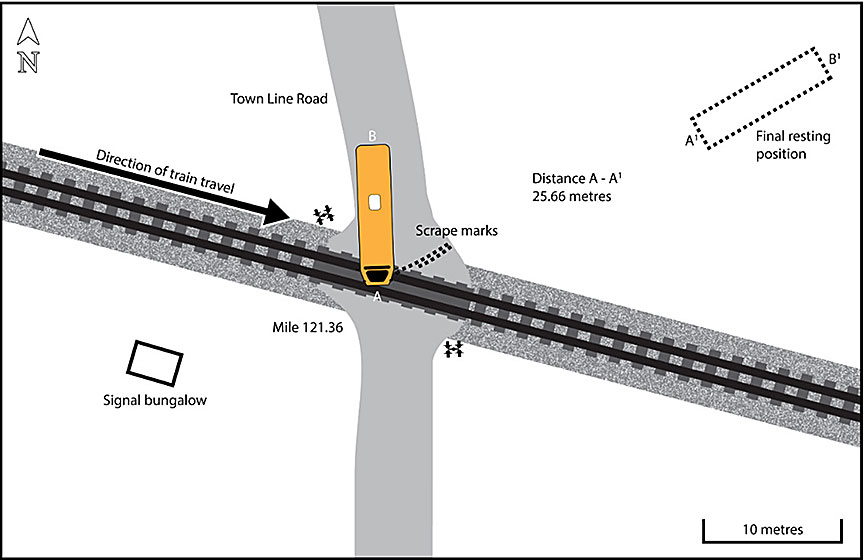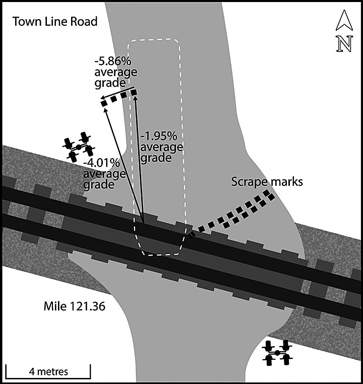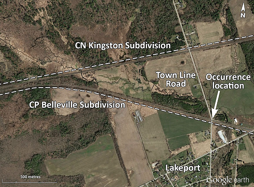 Town Line Road is an asphalt-paved road oriented in the north-south direction. The posted speed limit was 50 km/h. Two tracks intersect the road about 600 m apart: the Canadian National Railway Company (CN) Kingston Subdivision to the north and the CP Belleville Subdivision. The road intersects the Belleville Subdivision at 69° from the north and 75° from the south.