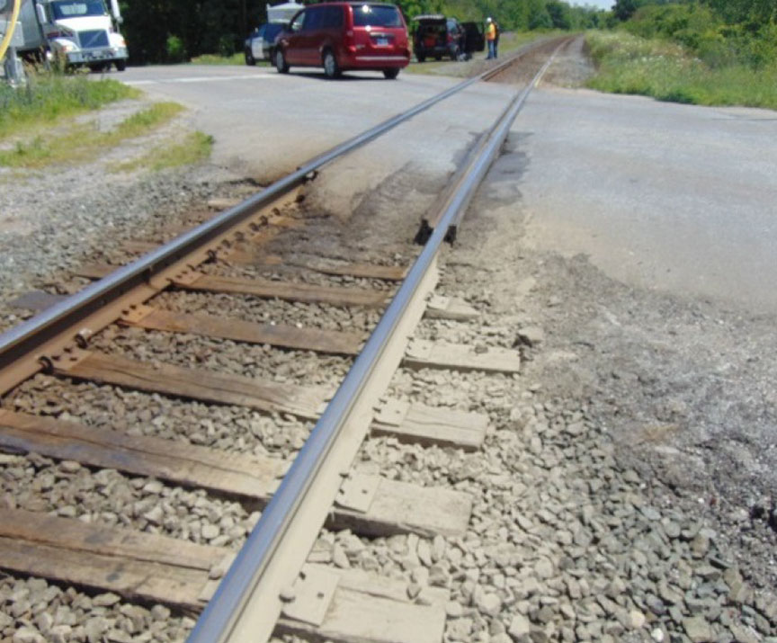Immediately west of the Caradoc Street South crossing, additional wheel marks were found on the field side of the north rail. These marks extended westward to Mile 19.98 where they intersected an asphalt platform adjacent to the track at the VIA Rail station. The platform was heavily damaged, and the track structure immediately west of the VIA Rail station platform and up to the Metcalfe Street West crossing was destroyed. Track damage was extensive west of Metcalfe Street West for about 350 feet, where the first derailed car came to rest.