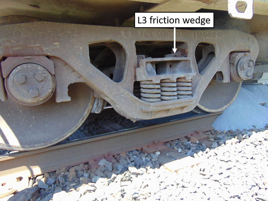 - Friction wedge rise. The L3 wedge rise on car NAHX 35909 had reached the AAR Rule 46 limit of 113/16 inches. This reduced the truck squaring and damping forces, and contributed to the elevated L/V ratio. When compared with the calculated L/V ratio of 0.82 in the occurrence case, with no wedge rise, the maximum L/V ratio at the initial derailment location was calculated to be 0.25. The wedge rise was the most influential of the 6 conditions that contributed to this occurrence.