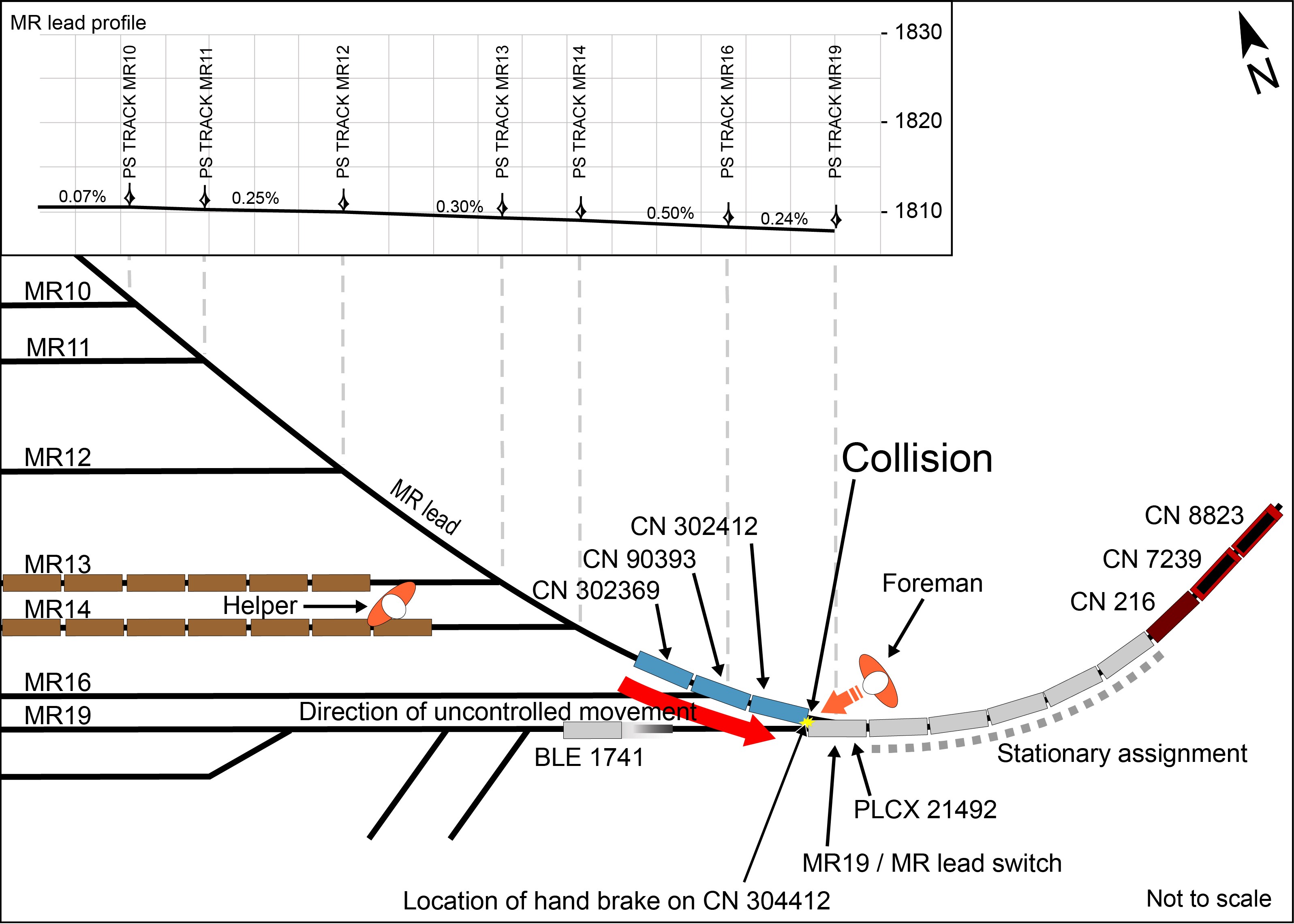 After the 3 open-top hopper cars passed over the MR19 switch, the foreman lined the switch in preparation for setting off the remaining car in track MR19. As the assignment reversed into track MR19, she noticed that the 3 cars had begun to stall on the MR-lead track. The cars came to a stop with the leading B end of car CN 302412 almost parallel with the MR16 switch. After stopping, all 3 cars began to roll back toward the assignment.