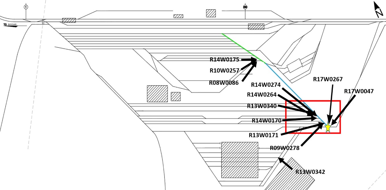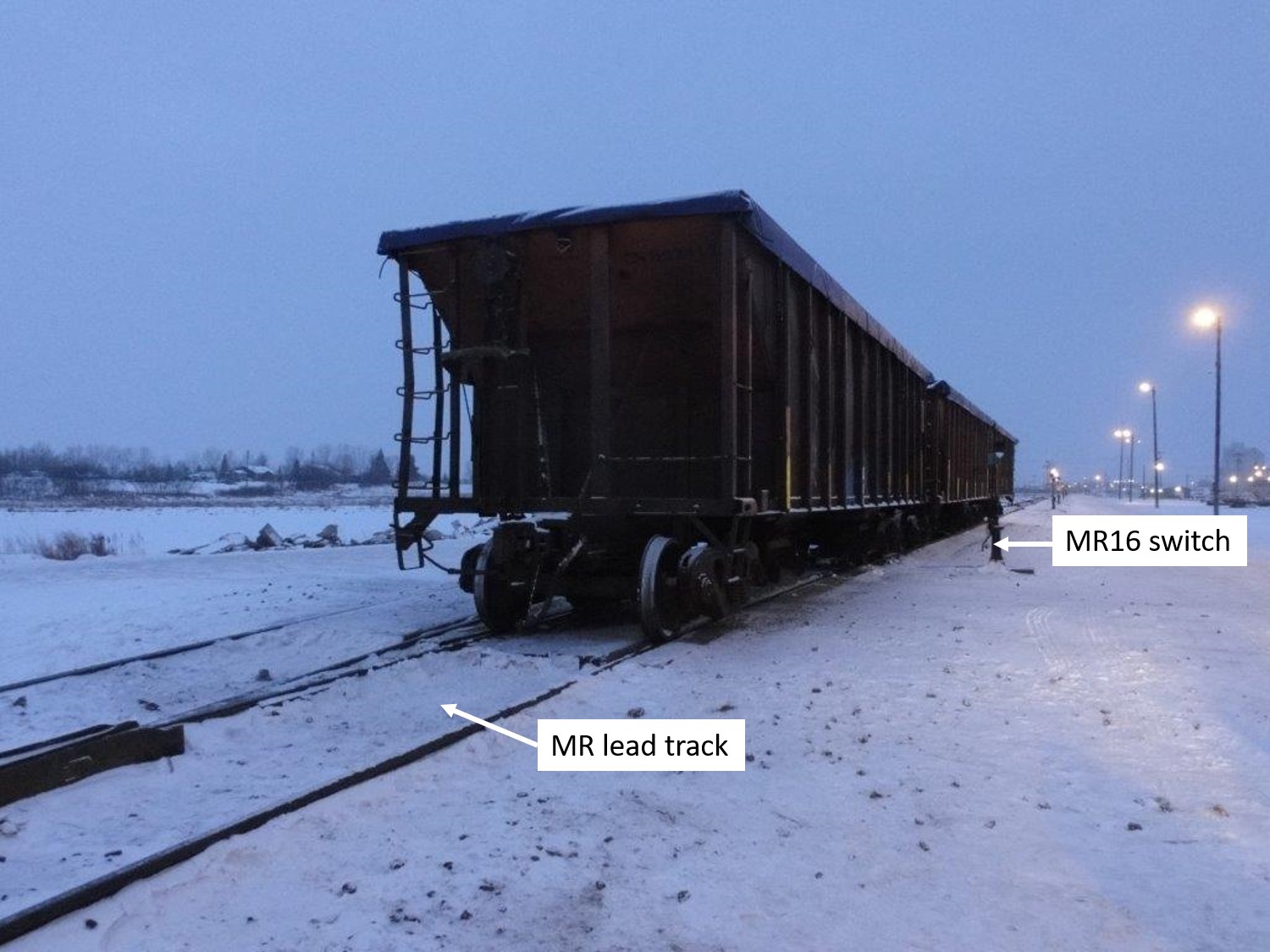 As the assignment came to a stop, with the uncoupling lever on CN 302412 lifted, the 3 open-top hopper cars (Figure 3) released and separated (and thus were kicked) from the assignment. Under their own momentum, the 3 cars travelled on the MR-lead track over the MR19 switch toward track MR13. The remainder of the assignment stopped east of the MR19 switch.